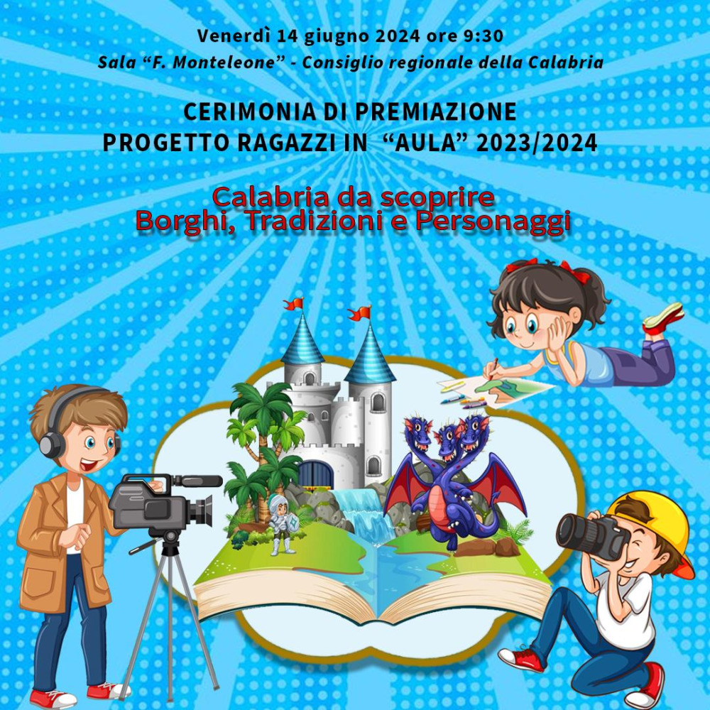 Concorso regionale “Ragazzi in aula”, si terrà venerdi 14 giugno alle ore 9.30, presso la Sala Monteleone di Palazzo Campanella a Reggio Calabria, l’evento conclusivo che vedrà la cerimonia di premiazione